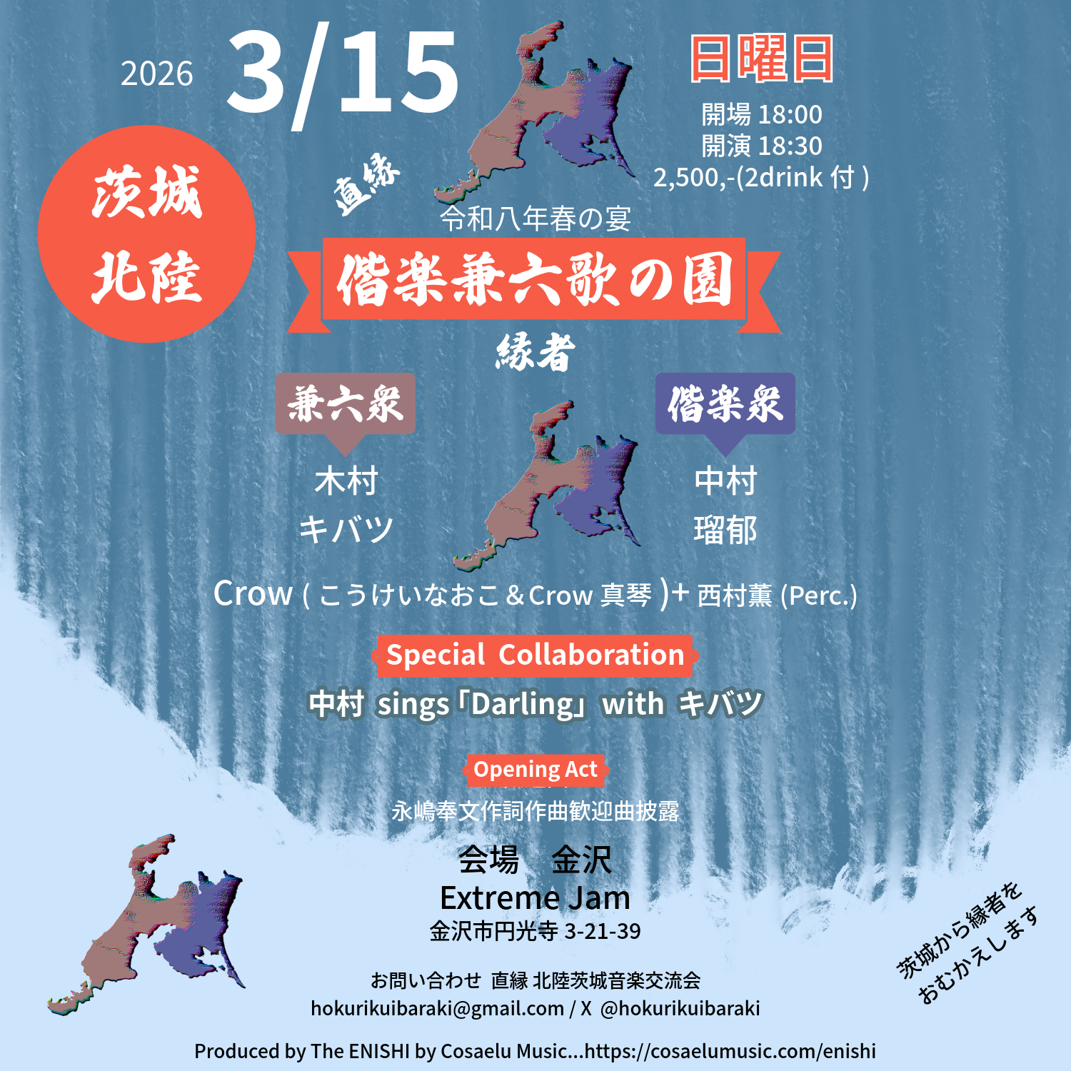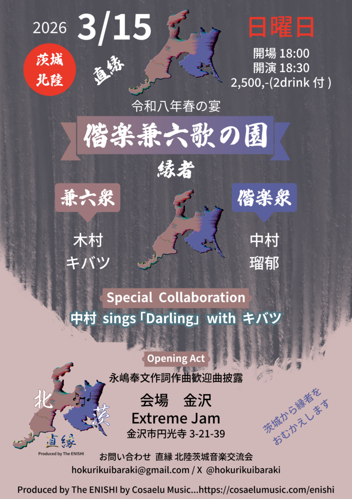 茨城県のシンガーソングライターを北陸に迎えてお届けするライブを出来れば恒例化しようと、茨城でお世話になっているキバツのみやりかとenu-G(木村菜緒)、そして富山県滑川市のワンカフェで茨城県のアーティストを迎えてのライブを企画されてきたマコトさん、そして、ワンカフェで茨城県のアーティストと共に共演されてきた明月友賀さん、そして何より、茨城県のアーティストとの縁を繋いだ、こうけいなおこさんの願いを込めてお届けするライブです!