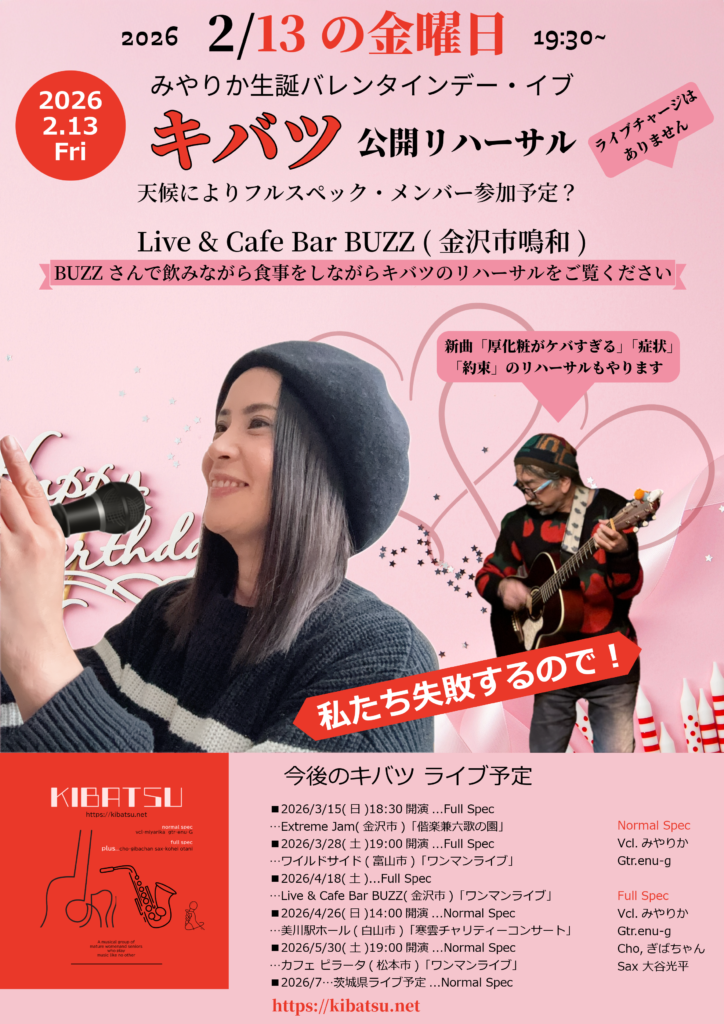 Live & Cafe Bar BUZZさんのおいしいお食事をしながら飲んでキバツのリハーサルをご覧ください!